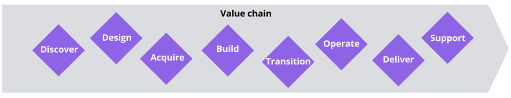 Jednotlivé VAlue chain aktivity reprezentujú ITIL Product and Service Lifecycle aktivity.